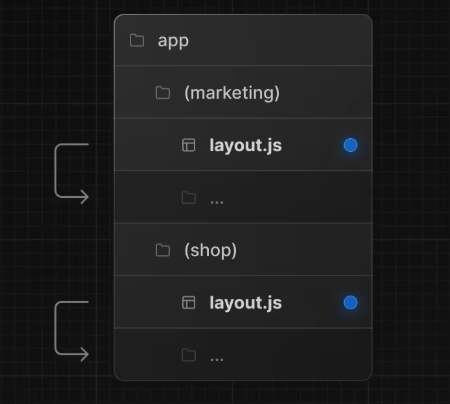 만약 여러 개의 루트 레이아웃을 구성하려면 최상위 layout.js 파일을 삭제하고 각 라우트 그룹 안에 layout.js파일을 추가해서 각 그룹마다의 자체적인 루트 레이아웃을 구성하게 할 수 있습니다.